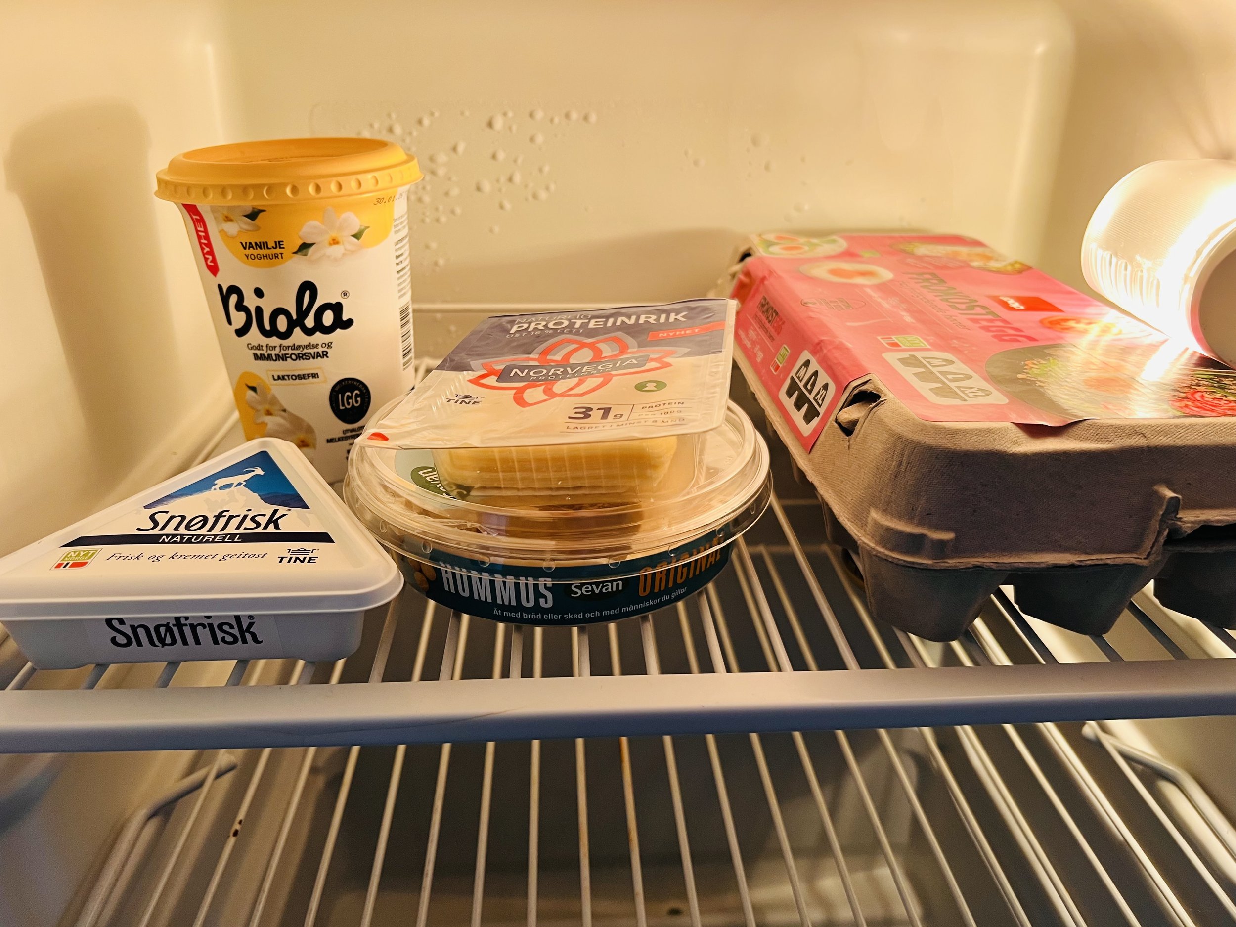 For example, I had four days in-between two teaching trips, but that first day back in Oslo, I didn’t need to dash out to the grocery store. I had strategically left food in the fridge, so I could stay in the apartment, start the laundry, and relax upon my return. Those items included hummus, sliced Norvegia cheese and Snøfrisk (goat cheese) for crackers, eggs, and yogurt. Not only are the items are regular part of my diet here in Norway, but they have a long fridge life. In the freezer, I always keep a small container of salmon and a bag of frozen vegetables.