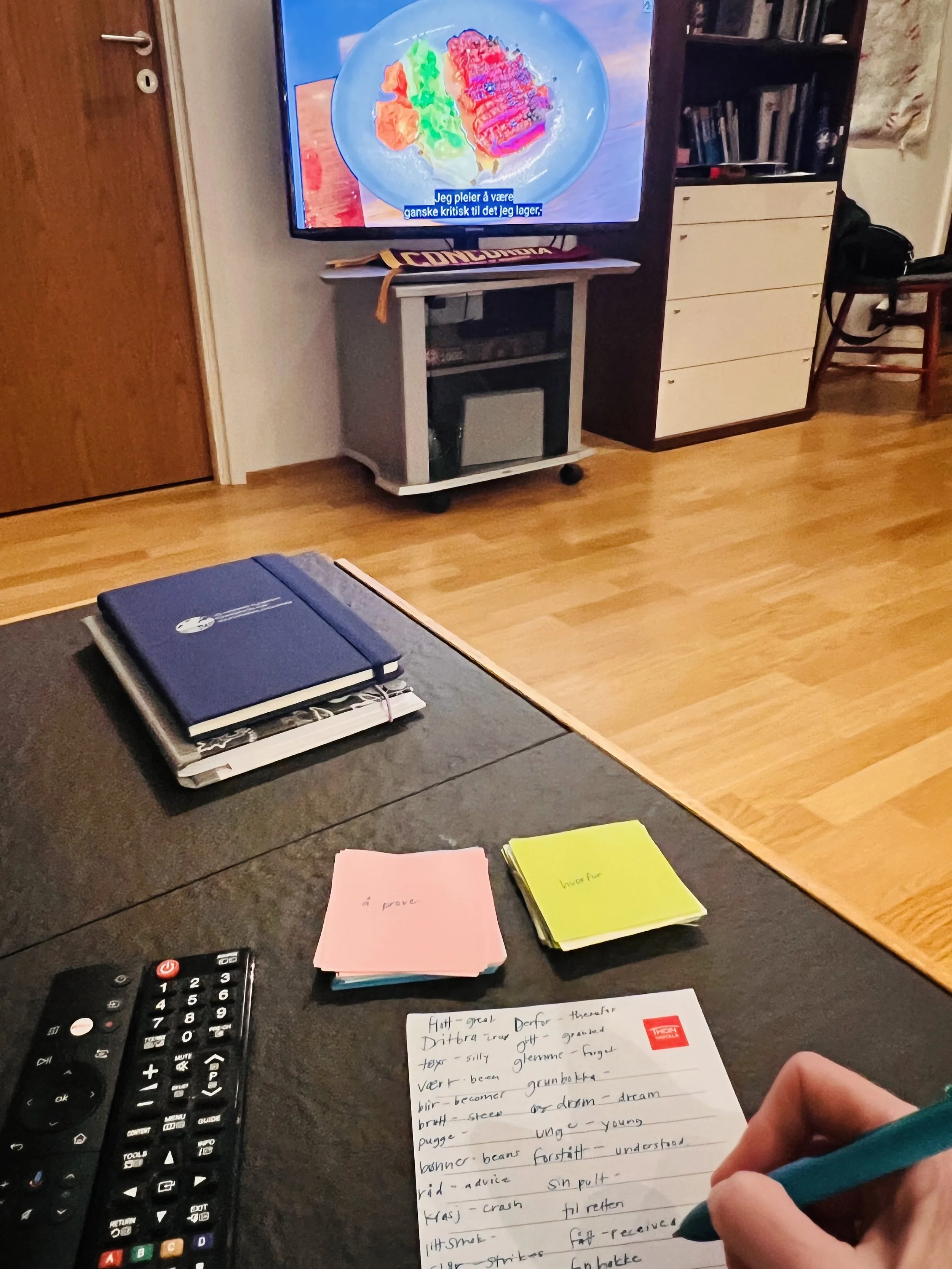 In addition to speaking confidence, I’m trying to be more focused on listening. Instead of instantly panicking when someone speaks to me in Norwegian, I’m trying to focus on what they are saying. To do this, I decided to watch some TV, something that I rarely do in the US. Once I figured out how to actually operate my TV, I found the show, Kokkeskolen (Cooking School); similar to the Great British Baking Show. I watch intently, listening carefully for words that I know, and then I write down unfamiliar words as I am able (thank you, subtitles!). I’ve already learned some helpful words like gaffel (fork), skje (spoon), kniv (knife), and tallerkin (plate). The slag and swear words are fun to hear because they are not found in my Norwegian-learning textbooks.